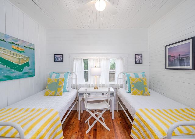 1 twin bed, but this is not a private room. This sleeping area is immediately upon entering the cottage. Please see photos.* Second bedroom has two twin beds.* Third bedroom has a queen size bed.* Bead Cottage has a full kitchen equipped with everything you need so that you have the option of preparing meals as if you were at home (on days when you want to kick back and stay put instead of looking for a restaurant). The breakfast area and living room have ample space to visit, eat and enjoy your Tybee tyme! The bathroom provides a standard tub and shower.